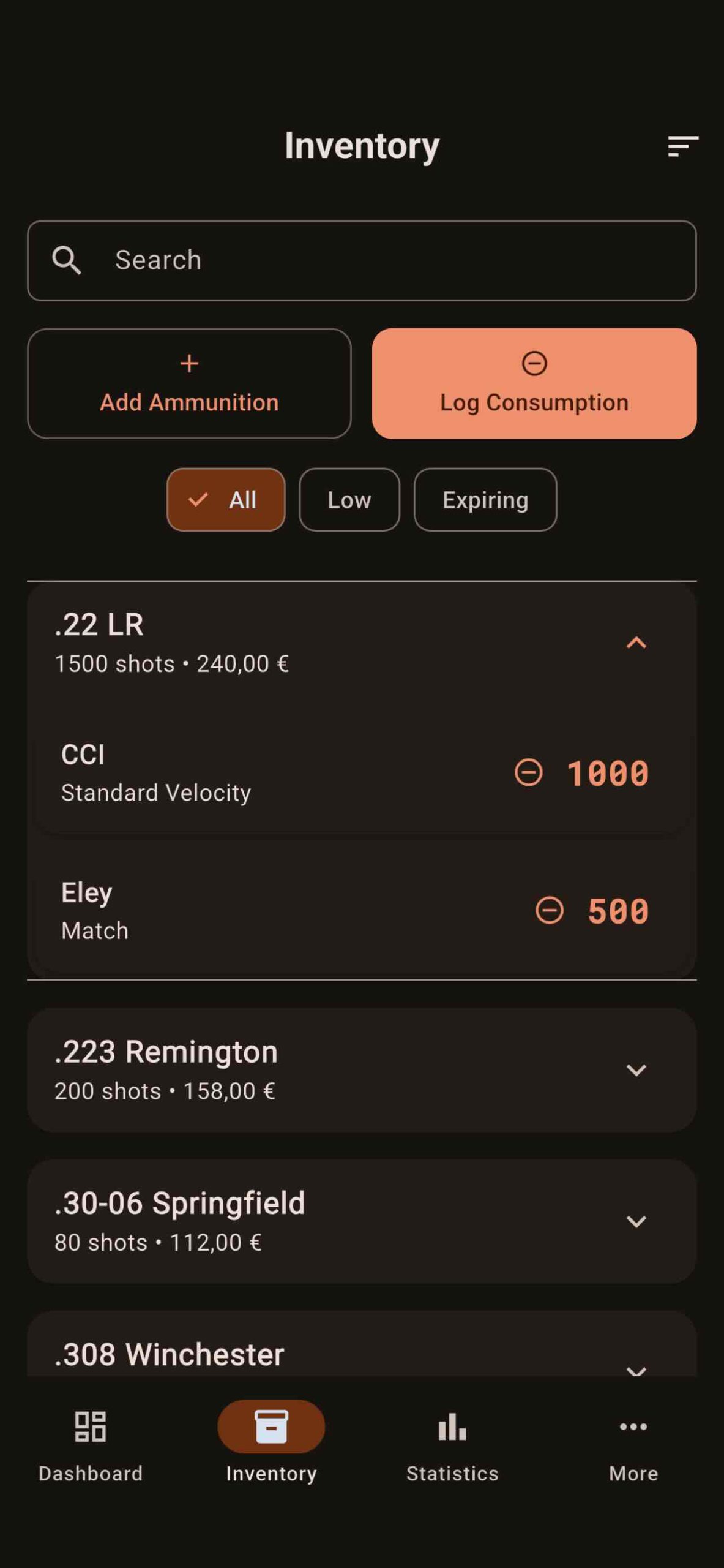 - Multi-caliber tracking – Organize ammunition by caliber, manufacturer, and product name