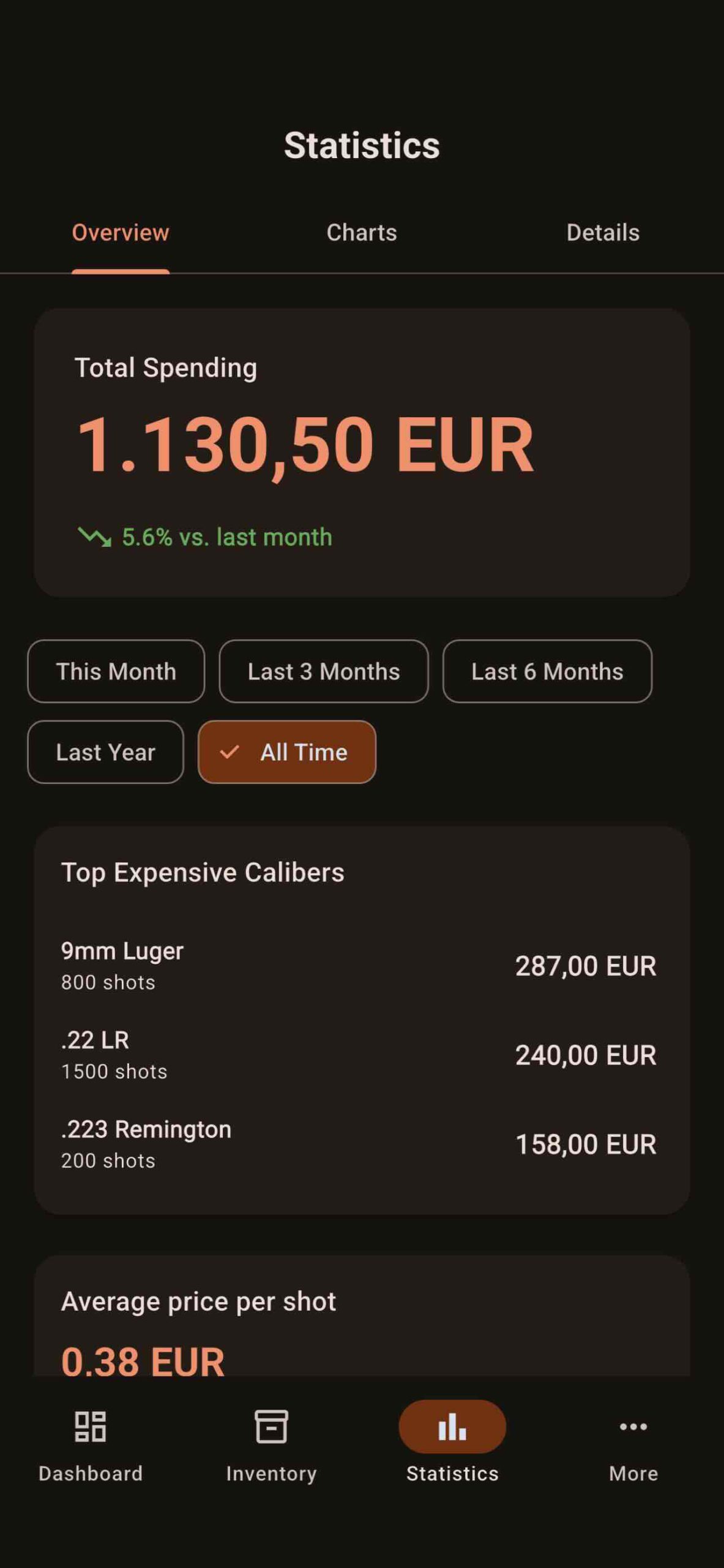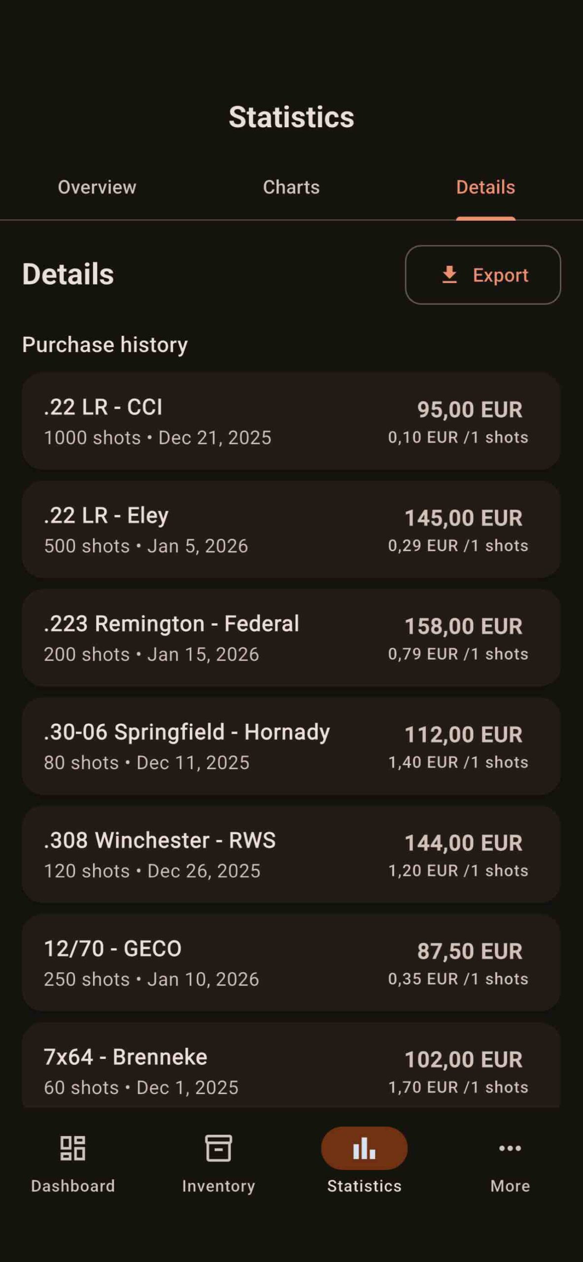 - Budget tracking – Monitor ammunition spending with detailed analytics